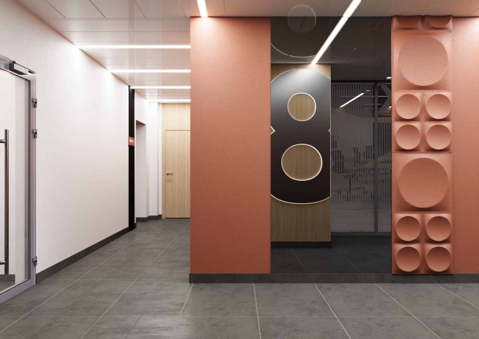 Еще один вариант решения пространства — офис, вдохновленный эстетикой советского модернизма, сочетает в себе монументальность архитектуры советского периода с современными материалами. Теплый терракотовый цвет стен, круглая лепнина с ее плавными линиями и геометрической строгостью и создает атмосферу солидности и надежности, отсылая к классическим советским интерьерам административных зданий. Эти элементы перекликаются с супрематической росписью стен, где динамичные композиции из геометрических фигур — квадратов, кругов и пересекающихся линий — оживляют пространство, внося в него энергию авангарда. Этот прием добавляет интерьеру ретрофутуристический шарм, напоминая о времени, когда архитектура стремилась к простоте, но не лишалась величия.